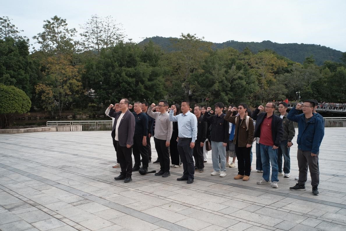 上午,队伍抵达梅州市叶剑英纪念园。在纪念园广场的鲜红党旗下,全体党员整齐列队,举起右拳,庄严重温入党誓词。既是对革命先辈的深切缅怀,也表达了党员们坚守初心使命、为教育事业和民族复兴不懈奋斗的坚定决心。